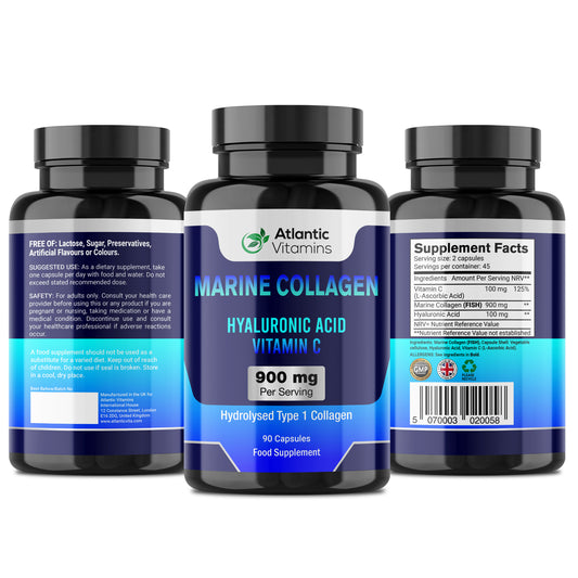 Marine Collagen 900 mg - High Strength 90 Collagen Caps with Hyaluronic Acid, Vitamin C for Skin, Joints and Hair - Type 1 Hydrolysed Collagen for Women & Men